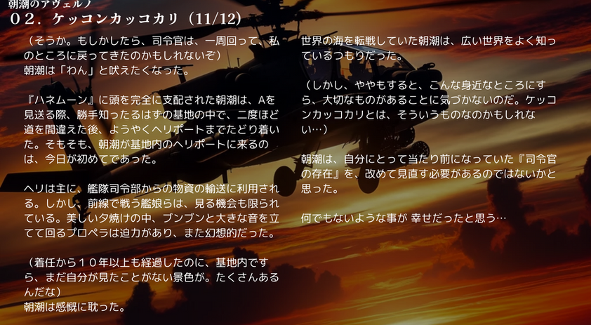 さてさて、制作途中の「艦これ小説」。すでに、書き上げてるんだけど、推敲にすげー時間がかかって。